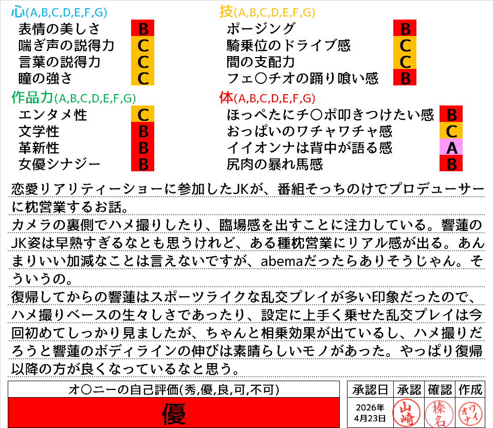 【AVレビュー】恋愛リアリティーショーの裏側 汗だくおじさんとの枕営業で潮吹き絶頂しまくりの天然早漏イクイク女子●生。 響蓮