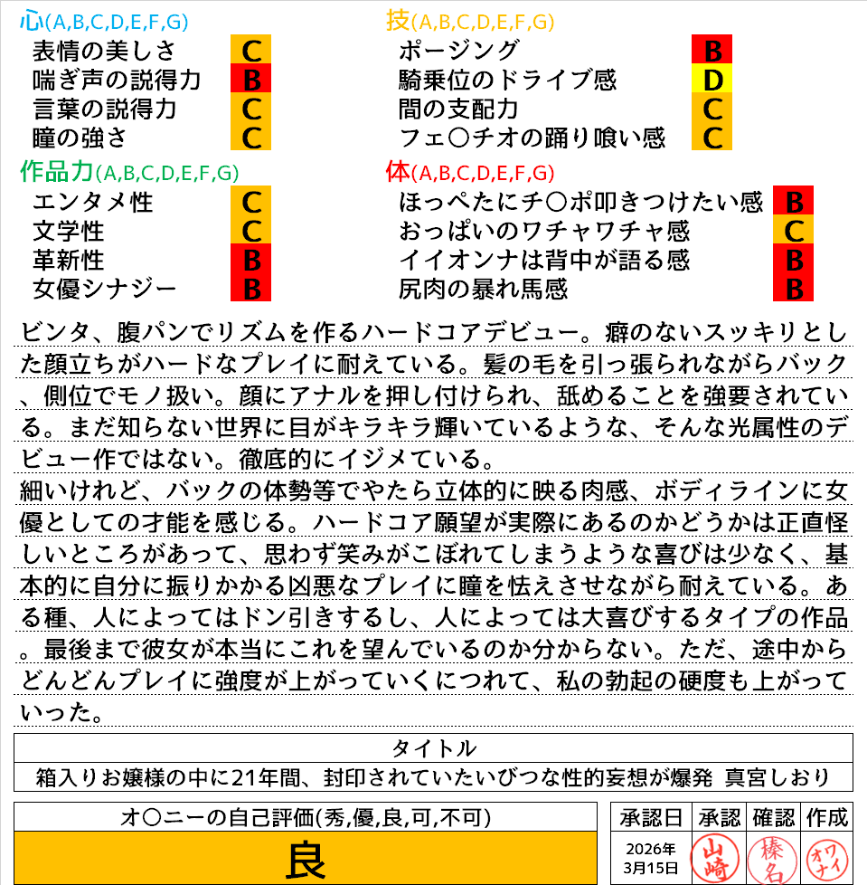 2026年3月16日に投稿 投稿者 waiona — コメントを残す【AVレビュー】親に逆らうことなど一度もなかった美少女が自らの意思でAV出演 箱入りお嬢様の中に21年間、封印されていたいびつな性的妄想が爆発 憧れ続けた被虐プレイに涙目で歓喜のマゾアクメ 真宮しおり 親に逆らうことなど一度もなかった美少女が自らの意思でAV出演 箱入りお嬢様の中に21年間、封印されていたいびつな性的妄想が爆発 憧れ続けた被虐プレイに涙目で歓喜のマゾアクメ 真宮しおり