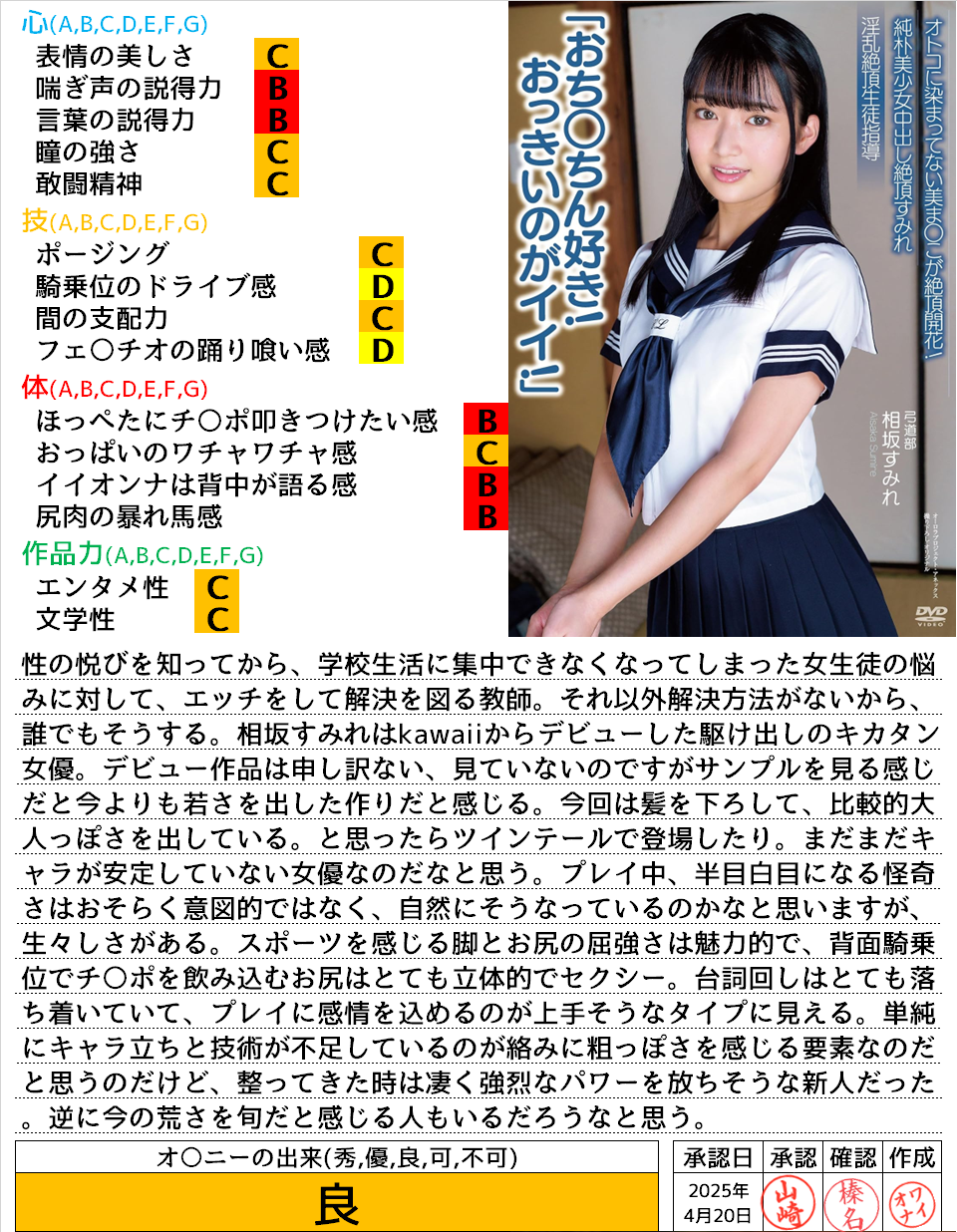 2025年4月20日に投稿 投稿者 waiona — コメントを残す【AVレビュー】純朴美少女中出し絶頂すみれ「おち○ちん好き!おっきいのがイイ!」 オトコに染まってない美ま○こが絶頂開花! 淫乱絶頂生徒指導 弓道部 相坂すみれ 純朴美少女中出し絶頂すみれ「おち○ちん好き!おっきいのがイイ!」 オトコに染まってない美ま○こが絶頂開花! 淫乱絶頂生徒指導 弓道部 相坂すみれ