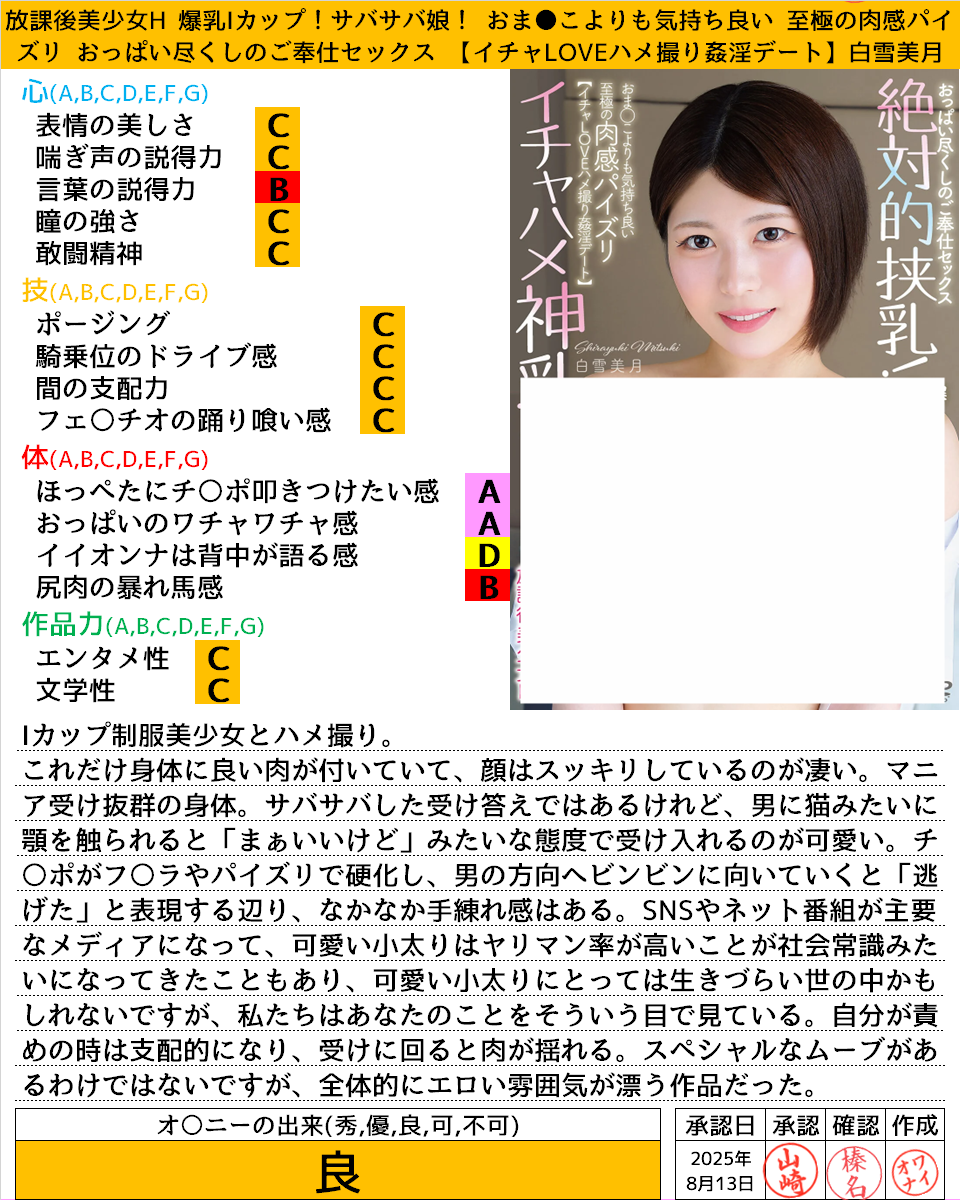 2025年8月13日に投稿 投稿者 waiona — コメントを残す【AVレビュー】放課後美少女H 爆乳Iカップ!サバサバ娘! おま●こよりも気持ち良い 至極の肉感パイズリ おっぱい尽くしのご奉仕セックス 【イチャLOVEハメ撮り姦淫デート】白雪美月 放課後美少女H 爆乳Iカップ!サバサバ娘! おま●こよりも気持ち良い 至極の肉感パイズリ おっぱい尽くしのご奉仕セックス 【イチャLOVEハメ撮り姦淫デート】白雪美月