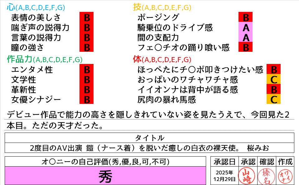 2025年12月29日に投稿 投稿者 waiona — コメントを残す【AVレビュー】2度目のAV出演 鎧(ナース着)を脱いだ癒しの白衣の裸天使。 退職までの数日間で撮影密着 本格AV女優への成長記録3本番 桜みお 2度目のAV出演 鎧(ナース着)を脱いだ癒しの白衣の裸天使。 退職までの数日間で撮影密着 本格AV女優への成長記録3本番 桜みお
