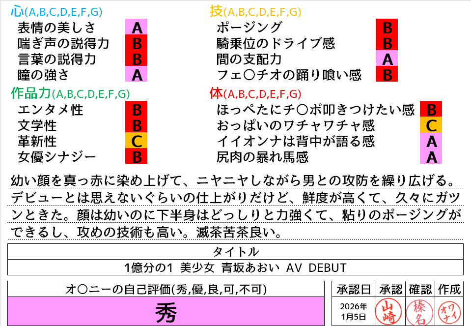 2026年1月7日に投稿 投稿者 waiona — コメントを残す【AVレビュー】1億分の1 美少女 青坂あおい AV DEBUT 日本国民の中で、とてもシャイで、とても素朴で、とてもエッチな、アダルト新人は、彼女だけ。 1億分の1 美少女 青坂あおい AV DEBUT 日本国民の中で、とてもシャイで、とても素朴で、とてもエッチな、アダルト新人は、彼女だけ。