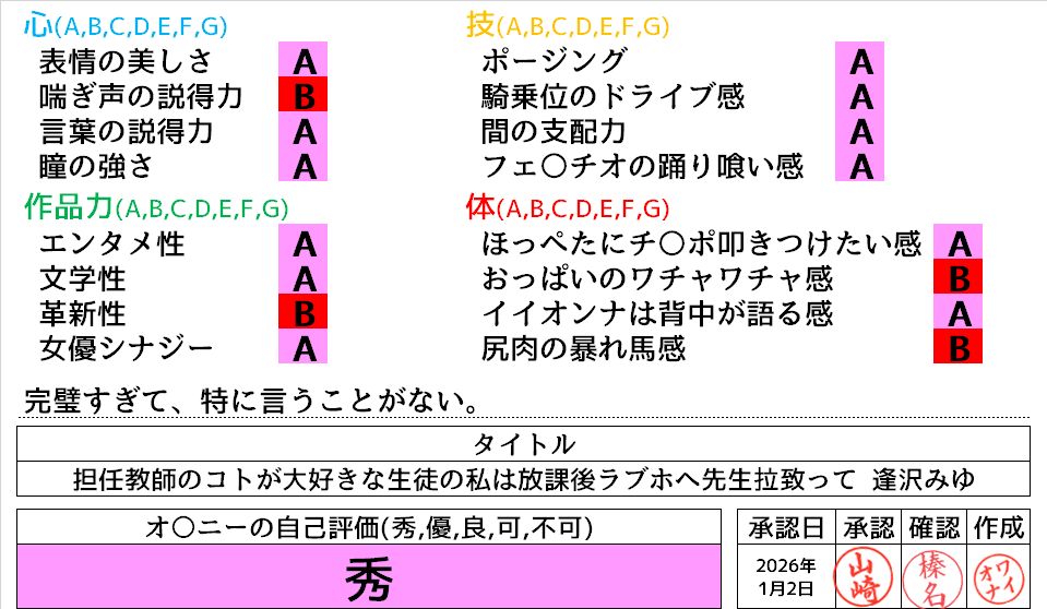 2026年1月6日に投稿 投稿者 waiona — コメントを残す【AVレビュー】担任教師のコトが大好きな生徒の私は放課後ラブホへ先生拉致って、ビッタンビッタン杭打ちまたがり何度も、何度も、中出しさせるの 逢沢みゆ 担任教師のコトが大好きな生徒の私は放課後ラブホへ先生拉致って、ビッタンビッタン杭打ちまたがり何度も、何度も、中出しさせるの 逢沢みゆ