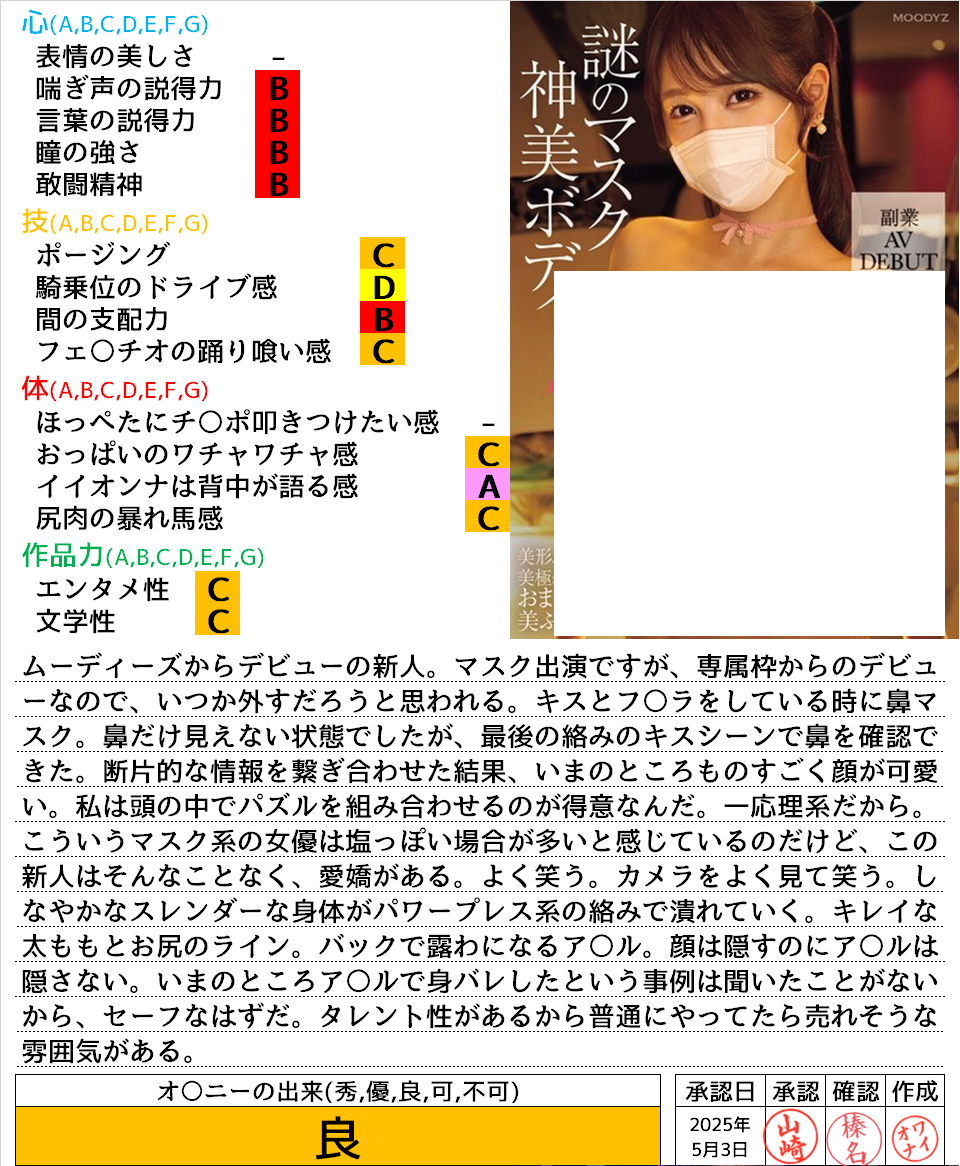 2025年5月3日に投稿 投稿者 waiona — コメントを残す【AVレビュー】謎のマスク神美ボディ 会社に内緒で副業AV DEBUT 清水こなつ 謎のマスク神美ボディ 会社に内緒で副業AV DEBUT 清水こなつ