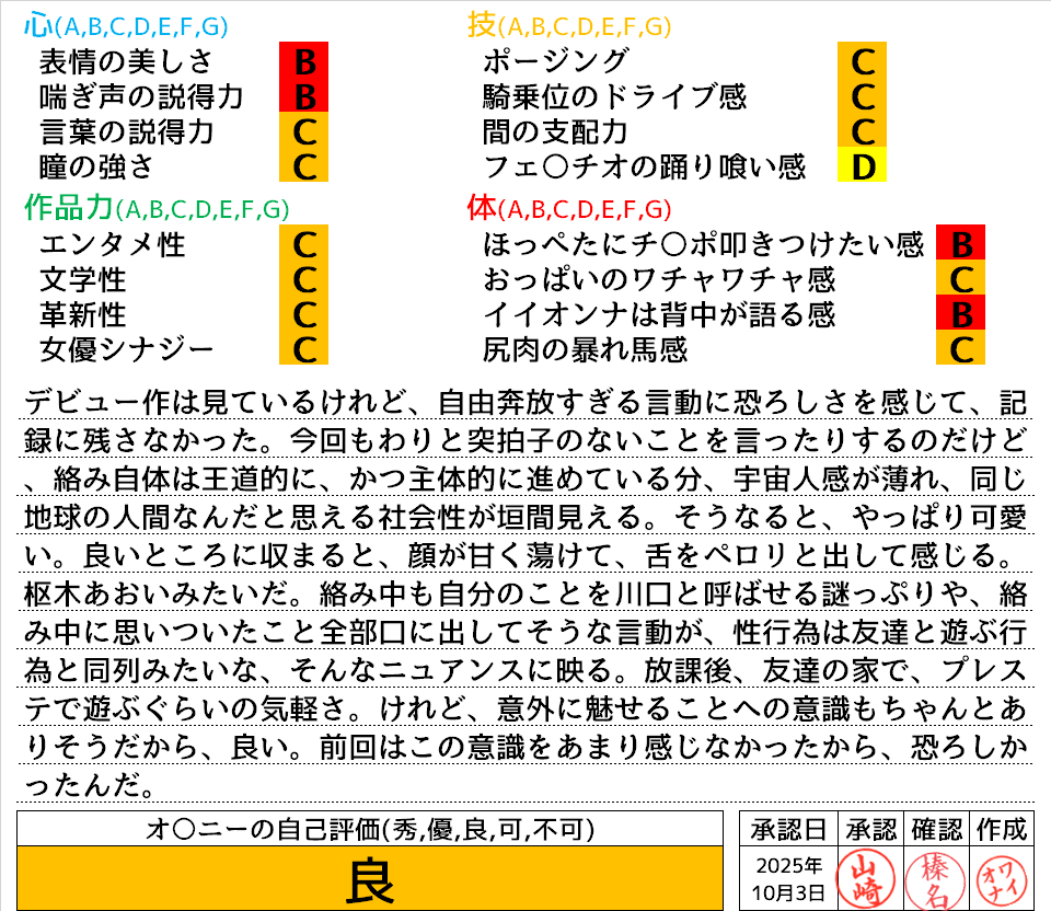 2025年10月3日に投稿 投稿者 waiona — コメントを残す【AVレビュー】ぜーんぶ初体験!!セックス開発4本番Special!! 川口桜 ぜーんぶ初体験!!セックス開発4本番Special!! 川口桜