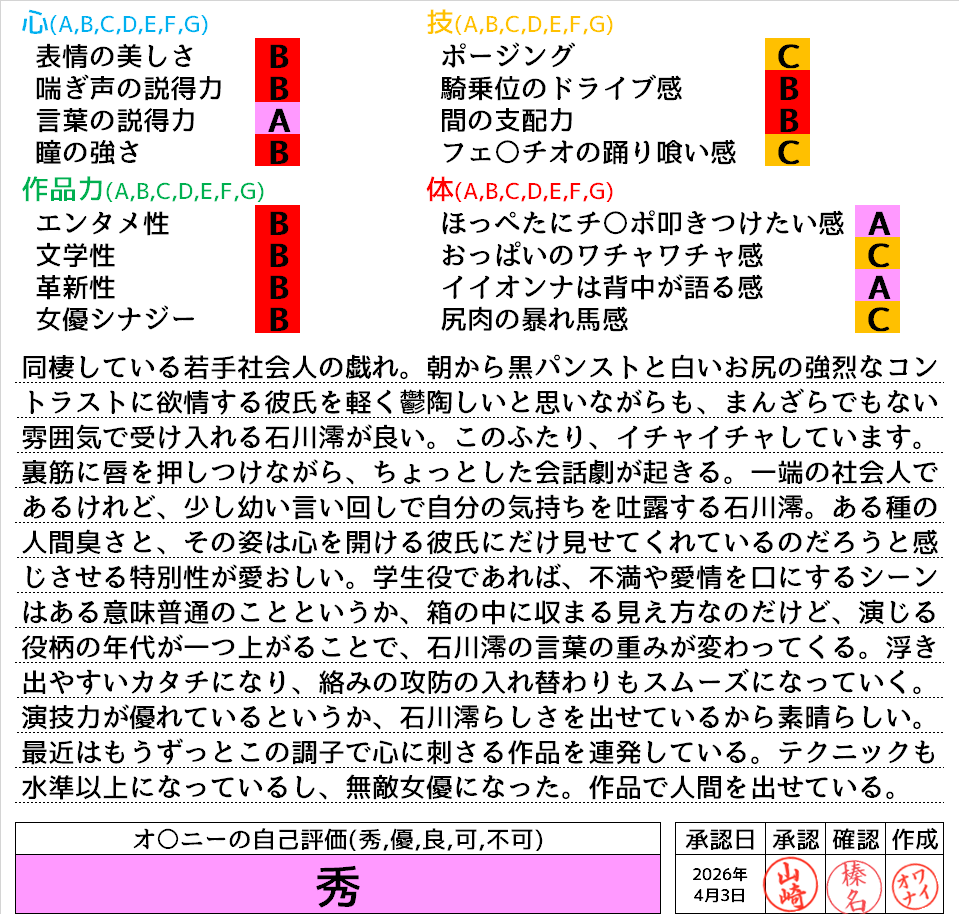 2026年4月4日に投稿 投稿者 waiona — コメントを残す【AVレビュー】「もうこれで最後…ねッ?お願いぃッ!」と朝セク決められ脚ガクガク痙攣しながらアクメ通勤してる私 同棲を始めて毎朝カレシが私の出社前パンストを破って困ってます 石川澪 「もうこれで最後…ねッ?お願いぃッ!」と朝セク決められ脚ガクガク痙攣しながらアクメ通勤してる私 同棲を始めて毎朝カレシが私の出社前パンストを破って困ってます 石川澪