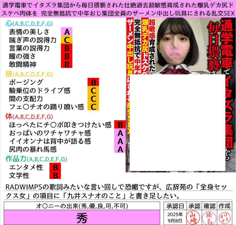 2025年9月8日に投稿 投稿者 waiona — コメントを残す【AVレビュー】通学電車でイタズラ集団から毎日猥褻された壮絶過去超敏感育成された爆乳デカ尻ドスケベ肉体を 完全無抵抗で中年おじ集団全員のザーメン中出し玩具にされる乱交SEX 通学電車でイタズラ集団から毎日猥褻された壮絶過去超敏感育成された爆乳デカ尻ドスケベ肉体を 完全無抵抗で中年おじ集団全員のザーメン中出し玩具にされる乱交SEX