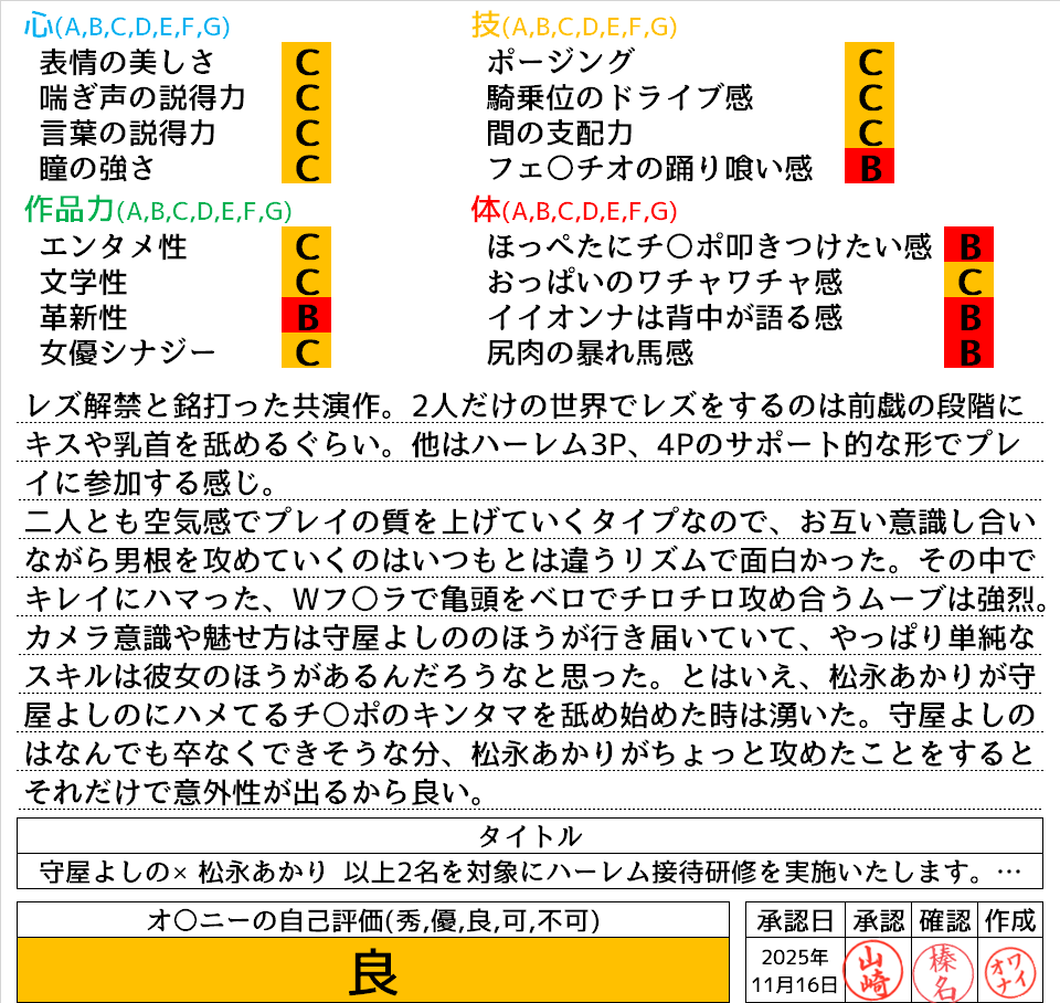 2025年11月16日に投稿 投稿者 waiona — コメントを残す【AVレビュー】守屋よしの×松永あかり 以上2名を対象にハーレム接待研修を実施いたします。SOD女子社員 【特典版】守屋よしの×松永あかり 以上2名を対象にハーレム接待研修を実施いたします。SOD女子社員