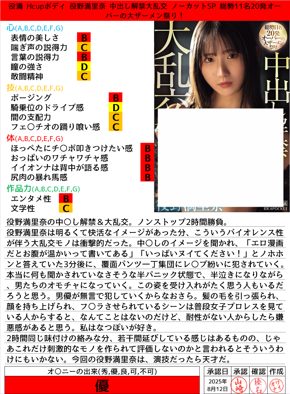 2025年8月12日に投稿 投稿者 waiona — コメントを残す【AVレビュー】役満 Hcupボディ 役野満里奈 中出し解禁大乱交 ノーカットSP 総勢11名20発オーバーの大ザーメン祭り! 役満 Hcupボディ 役野満里奈 中出し解禁大乱交 ノーカットSP 総勢11名20発オーバーの大ザーメン祭り!