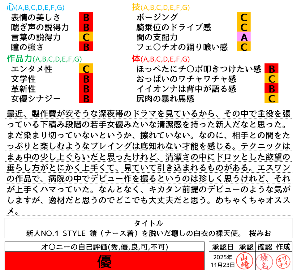 2025年11月23日に投稿 投稿者 waiona — コメントを残す【AVレビュー】新人NO.1 STYLE 鎧(ナース着)を脱いだ癒しの白衣の裸天使。 桜みお AV DEBUT 新人NO.1 STYLE 鎧(ナース着)を脱いだ癒しの白衣の裸天使。 桜みお AV DEBUT