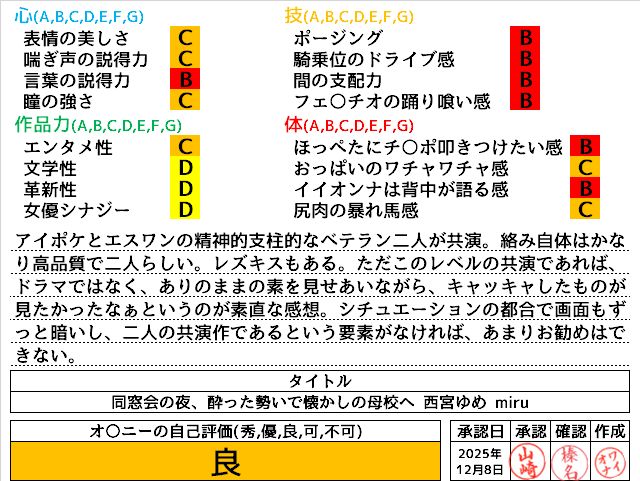 2025年12月8日に投稿 投稿者 waiona — コメントを残す【AVレビュー】同窓会の夜、酔った勢いで懐かしの母校へ 俺のことをずっと好きだった2人の幼馴染と 一夜限りの奪い合い背徳不倫 西宮ゆめ miru 同窓会の夜、酔った勢いで懐かしの母校へ 俺のことをずっと好きだった2人の幼馴染と 一夜限りの奪い合い背徳不倫 西宮ゆめ miru