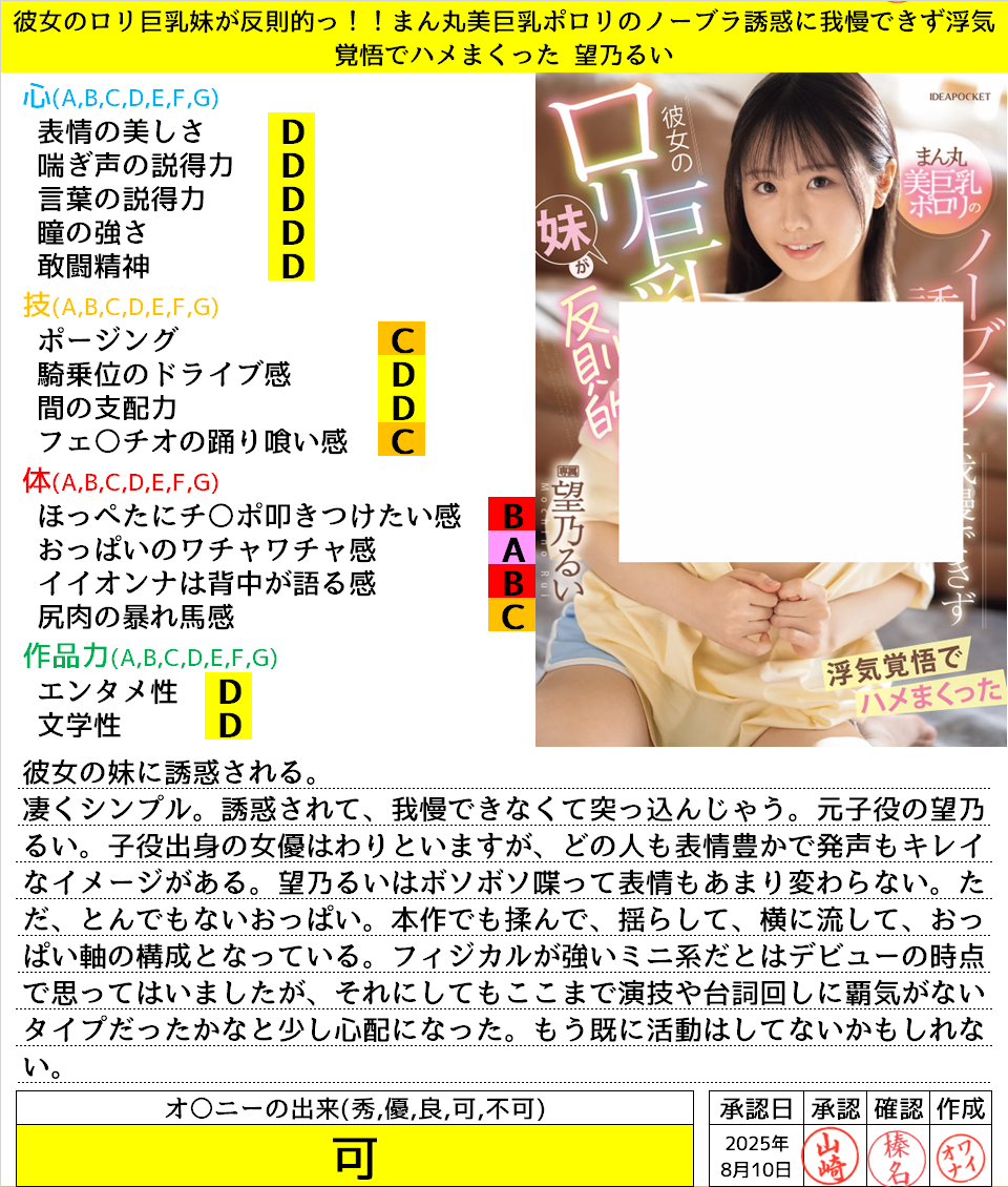 2025年8月10日に投稿 投稿者 waiona — コメントを残す【AVレビュー】彼女のロリ巨乳妹が反則的っ!!まん丸美巨乳ポロリのノーブラ誘惑に我慢できず浮気覚悟でハメまくった 望乃るい 彼女のロリ巨乳妹が反則的っ!!まん丸美巨乳ポロリのノーブラ誘惑に我慢できず浮気覚悟でハメまくった 望乃るい