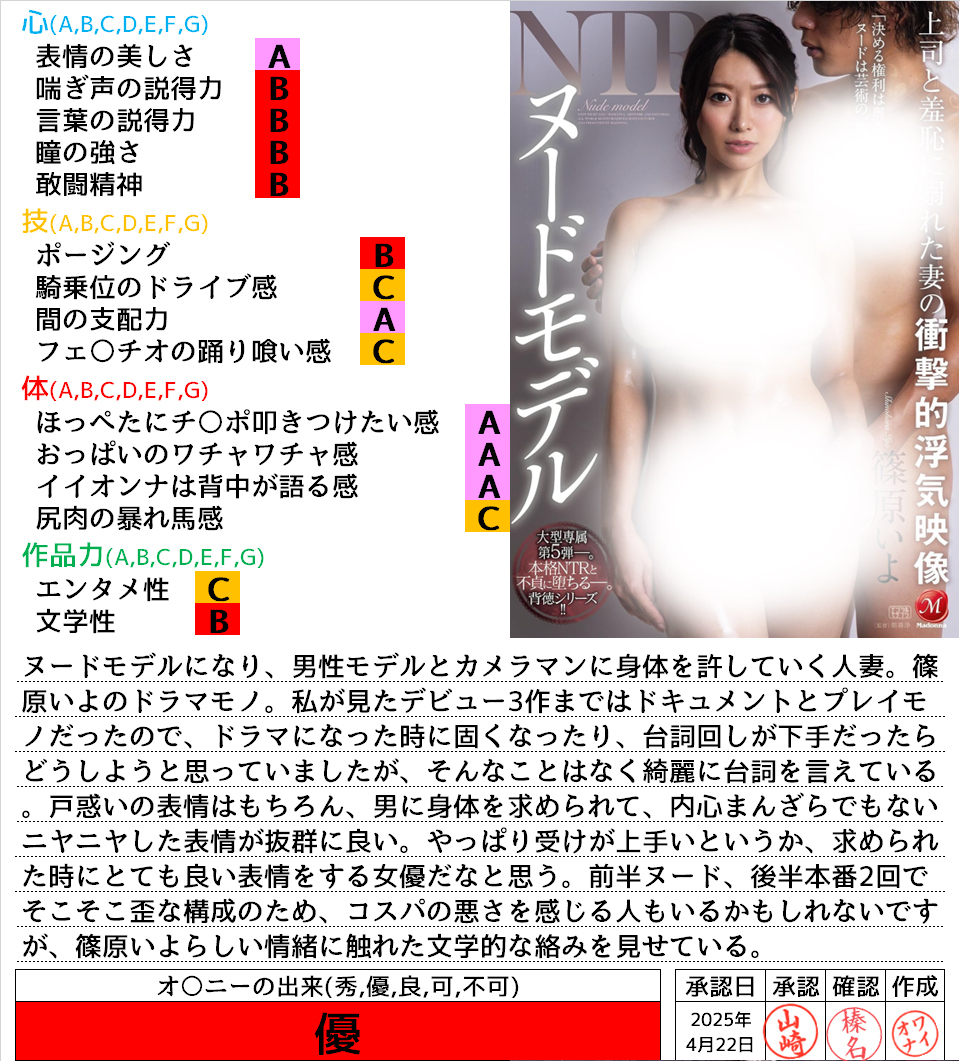 2025年4月22日に投稿 投稿者 waiona — コメントを残す【AVレビュー】ヌードモデルNTR 上司と羞恥に溺れた妻の衝撃的浮気映像 篠原いよ ヌードモデルNTR 上司と羞恥に溺れた妻の衝撃的浮気映像 篠原いよ